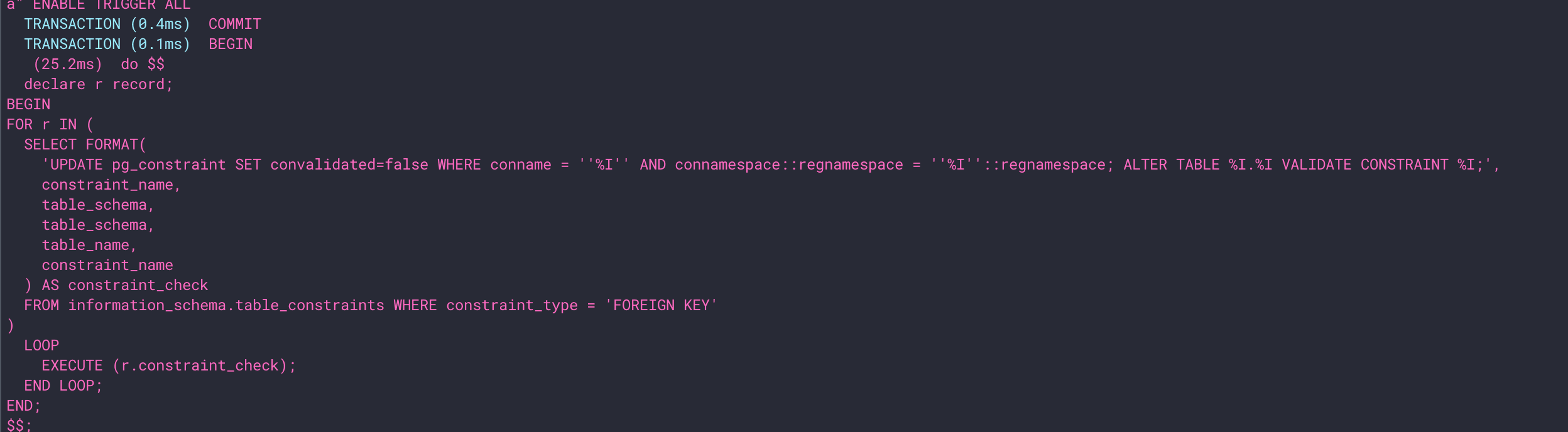 Here you can see that Rails is trying to validate the foreign key constraints. If you have a foreign key constraint that is invalid, this will cause the error we saw earlier. You can run this SQL in your database console to see which table is causing the issue. I'm using PostgreSQL so I can run this SQL command there to see what I get: